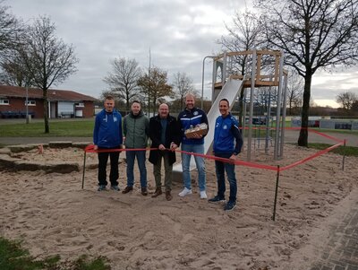 von links: Christoph Nowag und Markus Redbrake vom Vorstand, Karl Piochowiak als BM und Vertreter Gemeinde, Christian Siemann (Abteilungsleiter Jugendfußball) und Reinhard Tidde (Abteilungsleiter Fußball)